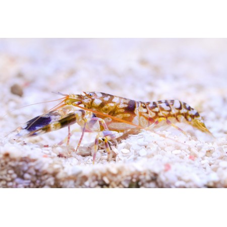 Pistol shrimp are a unique species of shrimp that look more like a lobster than a shrimp. They have lots of interesting traits including an ability to create a loud snapping sound for defensive and prey capturing smaller prey items. They also form symbiotic relationships with gobies where the goby will be the watch guard to a shared burrow and the shrimp will be the excavator. Pistol shrimp do enjoy burrowing so ensure an adequate sanded is available. They tend to be more shy in nature however will be easily found by their burrow they will form. They are reef safe however ensure they are not placed with nano shrimp species who may become prey.